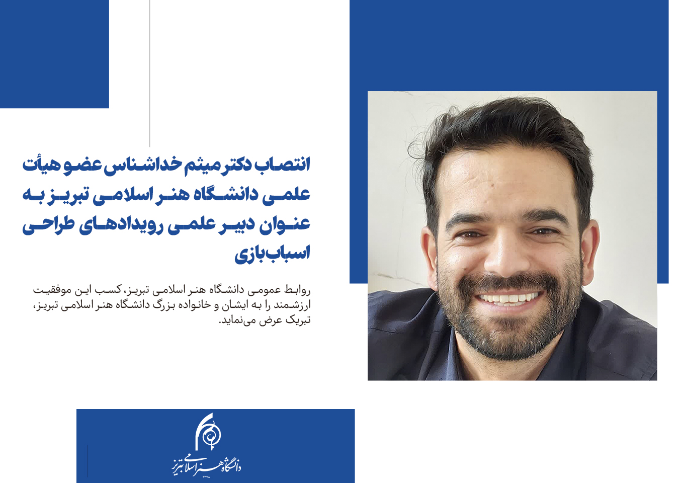 آقای دکتر میثم خداشناس، استادیار دانشکده طراحی دانشگاه هنر اسلامی تبریز، با حکم مدیرعامل کانون پرورش فکری کودکان و نوجوانان به عنوان دبیر علمی زنجیره رویدادهای طراحی اسباب بازی منصوب شد. این رویداد با هدف شناسایی و پرورش دانشجویان و دانش‌آموزان مستعد برگزار می‌شود.