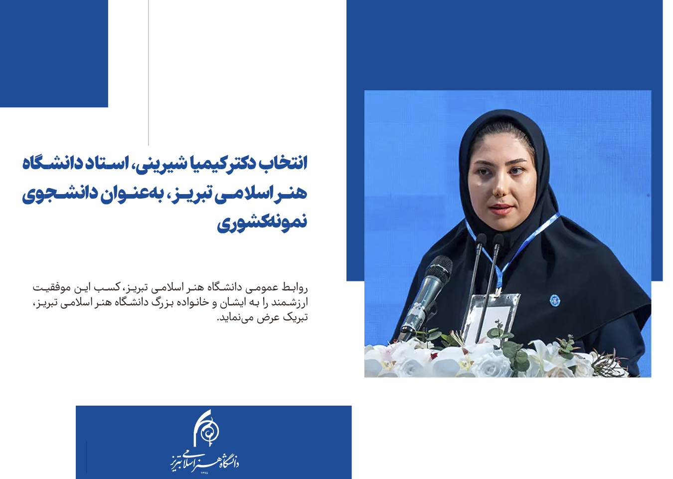 دکتر کیمیا شیرینی، استاد مدعو دانشکده چندرسانه‌ای دانشگاه هنر اسلامی تبریز، در سی‌ودومین جشنواره دانشجوی نمونه کشوری به‌عنوان دانشجوی نمونه کشوری انتخاب شد. این موفقیت، افتخاری ارزشمند برای دانشگاه هنر اسلامی تبریز به شمار می‌رود.