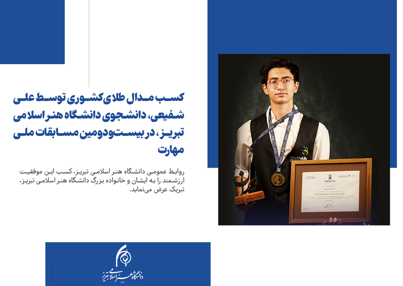 به گزارش روابط عمومی و امور بینالملل دانشگاه هنر اسلامی تبریز، آقای علی شفیعی، دانشجوی دانشکده هنرهای تجسمی این دانشگاه، در بیستودومین مسابقات ملی مهارت کشور موفق به کسب مدال طلای کشوری در رشته فناوری طراحی گرافیک شد. این دوره از مسابقات با حضور بیش از ۷۰۰ مهارتآموز از سراسر کشور و ۲۵ طراح از رشته فناوری طراحی گرافیک، به همت سازمان آموزش فنی و حرفهای کشور برگزار گردید. آقای شفیعی که بهعنوان نماینده استان اردبیل در این رقابتها شرکت کرده بود، توانست با عملکرد درخشان خود عنوان قهرمان کشور را در رشته تخصصی خود بهدست آورد و به اردوی تیم ملی مهارت ایران راه یابد تا برای حضور در مسابقات جهانی مهارت ۲۰۲۶ در شانگهای چین آماده شود. کسب این افتخار بزرگ، بیانگر توانمندی، خلاقیت و پشتکار دانشجویان دانشگاه هنر اسلامی تبریز در عرصههای ملی و بینالمللی مهارت و هنر است. 🌹 دانشگاه هنر اسلامی تبریز ضمن تبریک به آقای علی شفیعی، توفیقات روزافزون علمی، هنری و مهارتی ایشان را در مسیر موفقیتهای آینده آرزو دارد.