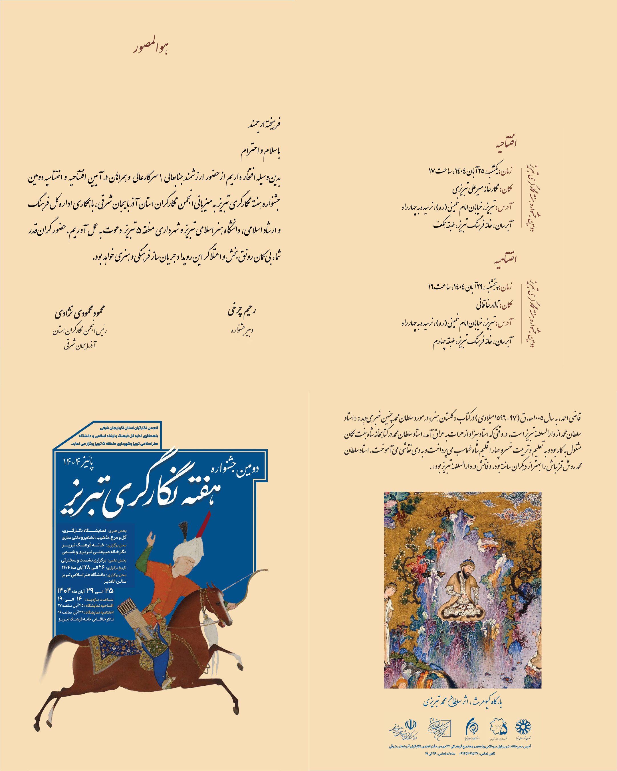 «دومین هفته نگارگری تبریز» ادامه روند موفقیتآمیز نخستین دوره این رویداد است که سال گذشته با استقبال گسترده هنرمندان و پژوهشگران برگزار شد و امسال نیز با هدف تقویت تعاملات هنری و معرفی ظرفیتهای نگارگری تبریز میزبان علاقهمندان خواهد بود.