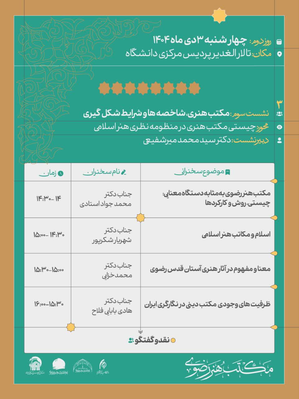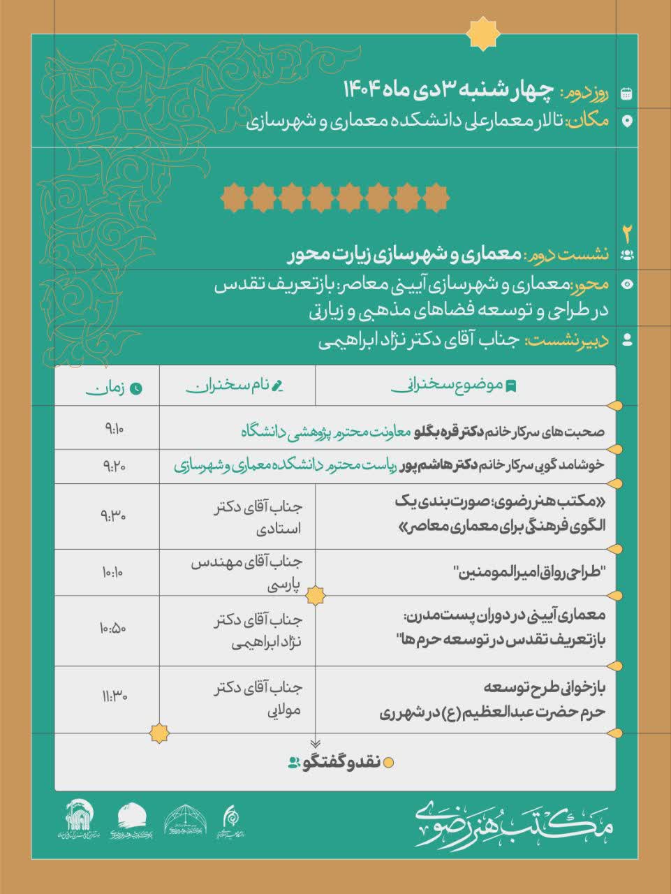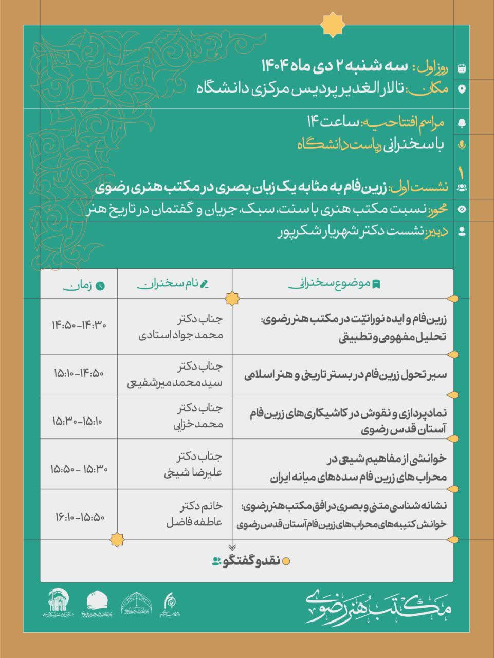 به گزارش روابط عمومی و امور بینالملل دانشگاه هنر اسلامی تبریز، پیشنشستهای کنگره بینالمللی «مکتب هنر رضوی» به مناسبت هفته پژوهش، به همت دانشگاه هنر اسلامی تبریز و با مشارکت مراکز آفرینشهای هنری آستان قدس رضوی، در روزهای سهشنبه و چهارشنبه ۲ و ۳ دیماه ۱۴۰۴ برگزار میشود.