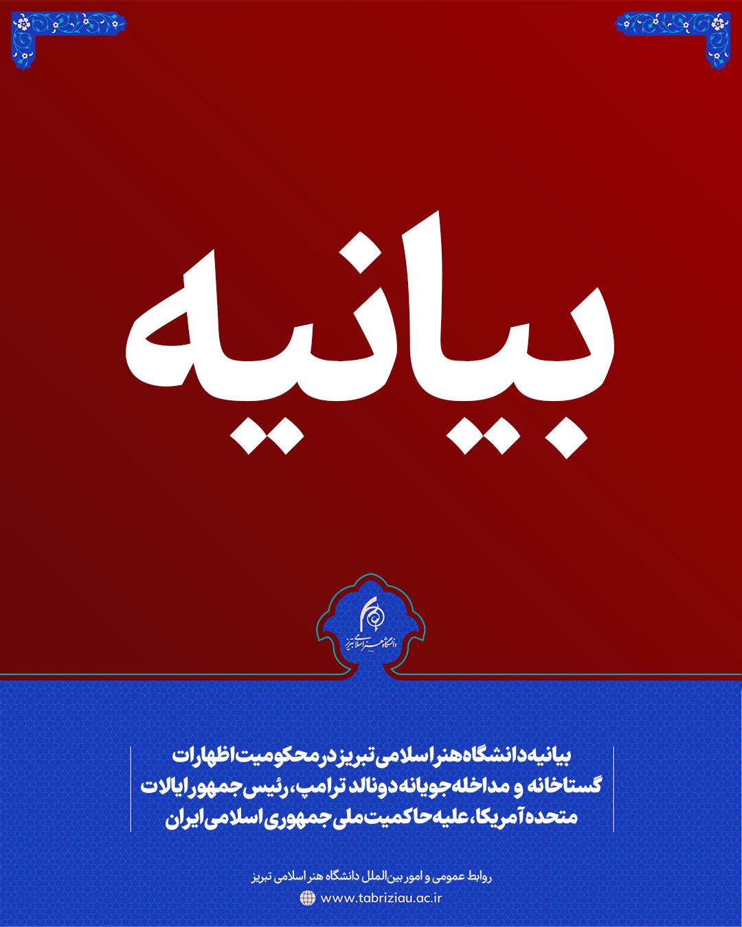 دانشگاه هنر اسلامی تبریز اظهارات گستاخانه و مداخله آمیز دونالد ترامپ رئیس جمهور ایالات متحده آمریکا را به شدت محکوم می نماید.
